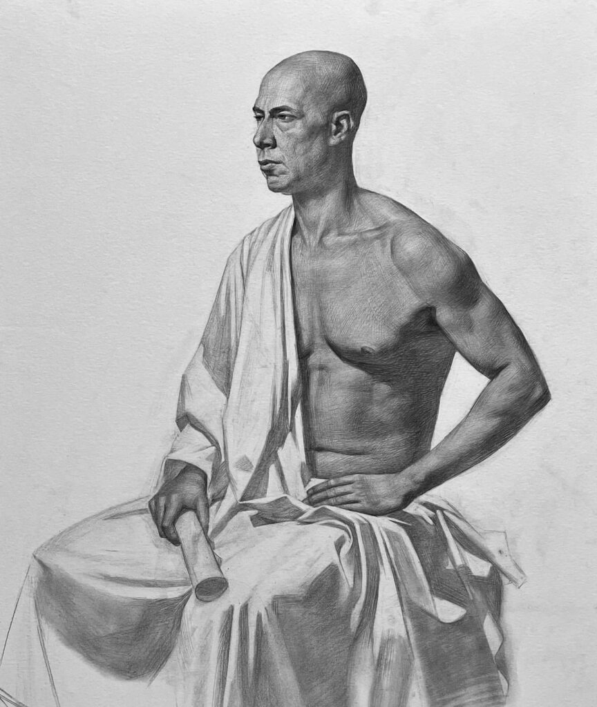 2017. Charcoal and soft pastel on toned paper. 50 x 40 cm.Copy of Raffaello Sanzio’s Theology from 1508
